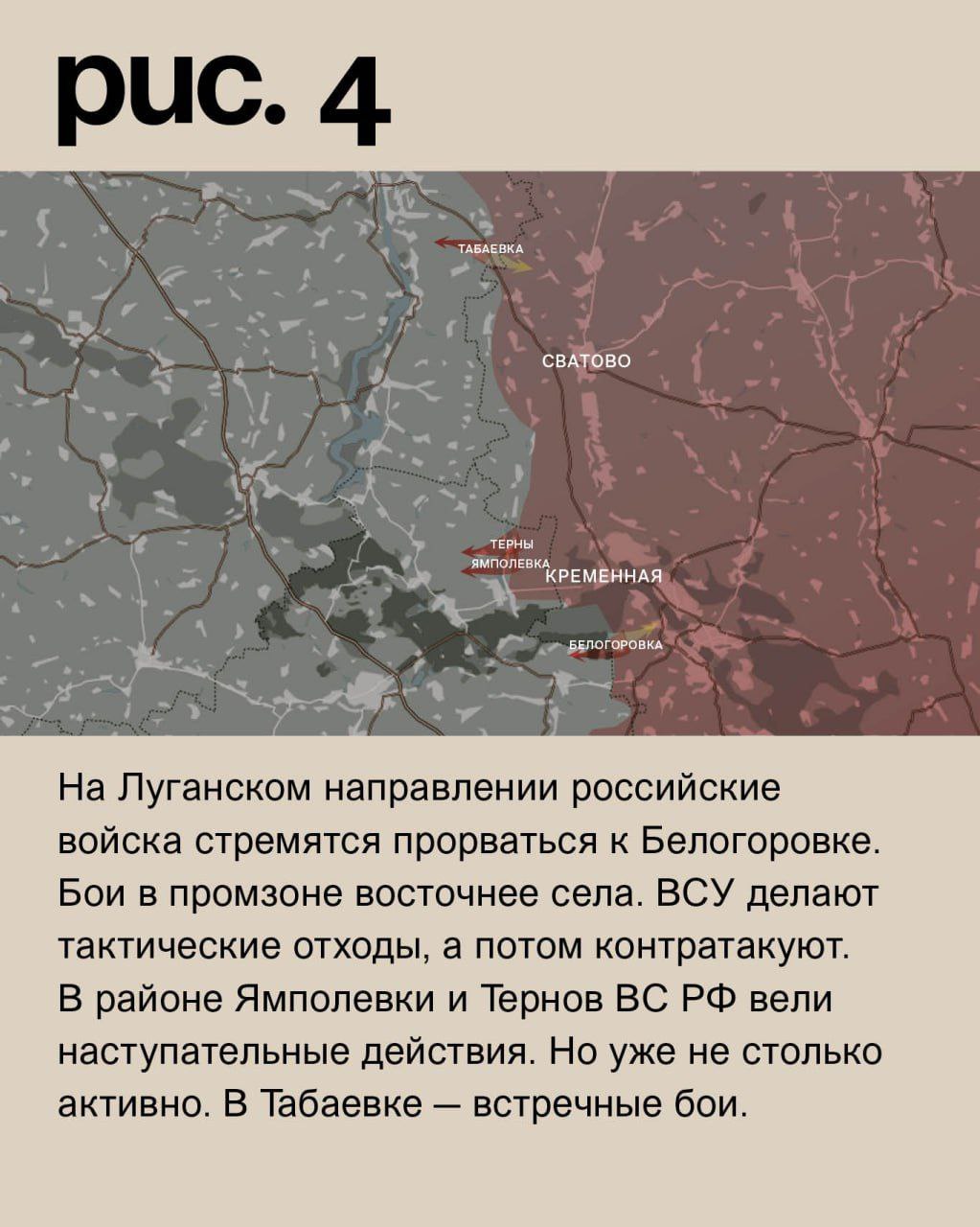 На Луганском направлении российские войска стремятся прорваться к Белогоровке. Бои в промзоне восточнее села. ВСУ делают тактические отходы, а потом контратакуют. В районе Ямполевки и Тернов ВС РФ вели наступательные действия. Но уже не столько активно. В Табаевке – встречные бои. (Рис. 4)