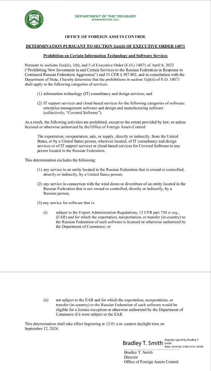 • 12 сентября вступят в силу санкции Минфина США. В июне ведомство наложило запрет на поставки софта и IT-услуг любым лицам на территории России;