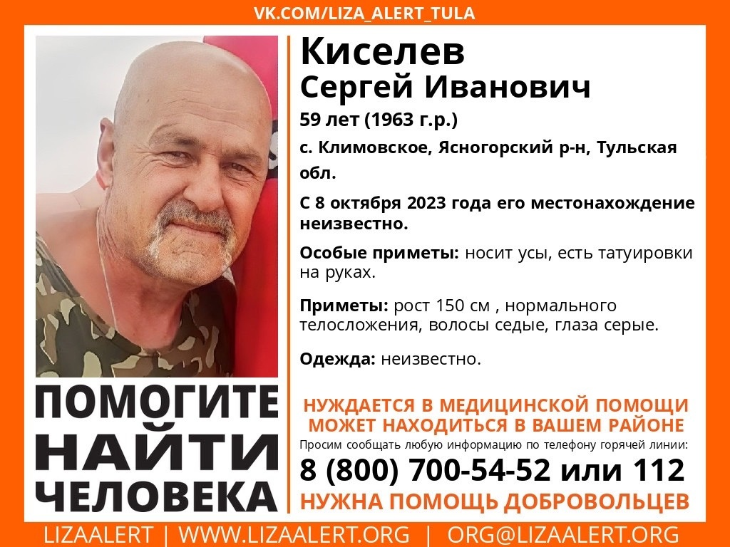 В селе Климовское Ясногорского района Тульской области пропал 59-летний мужчина Киселев Сергей Иванович. Его местонахождение неизвестно с 8 октября 2023 года.
