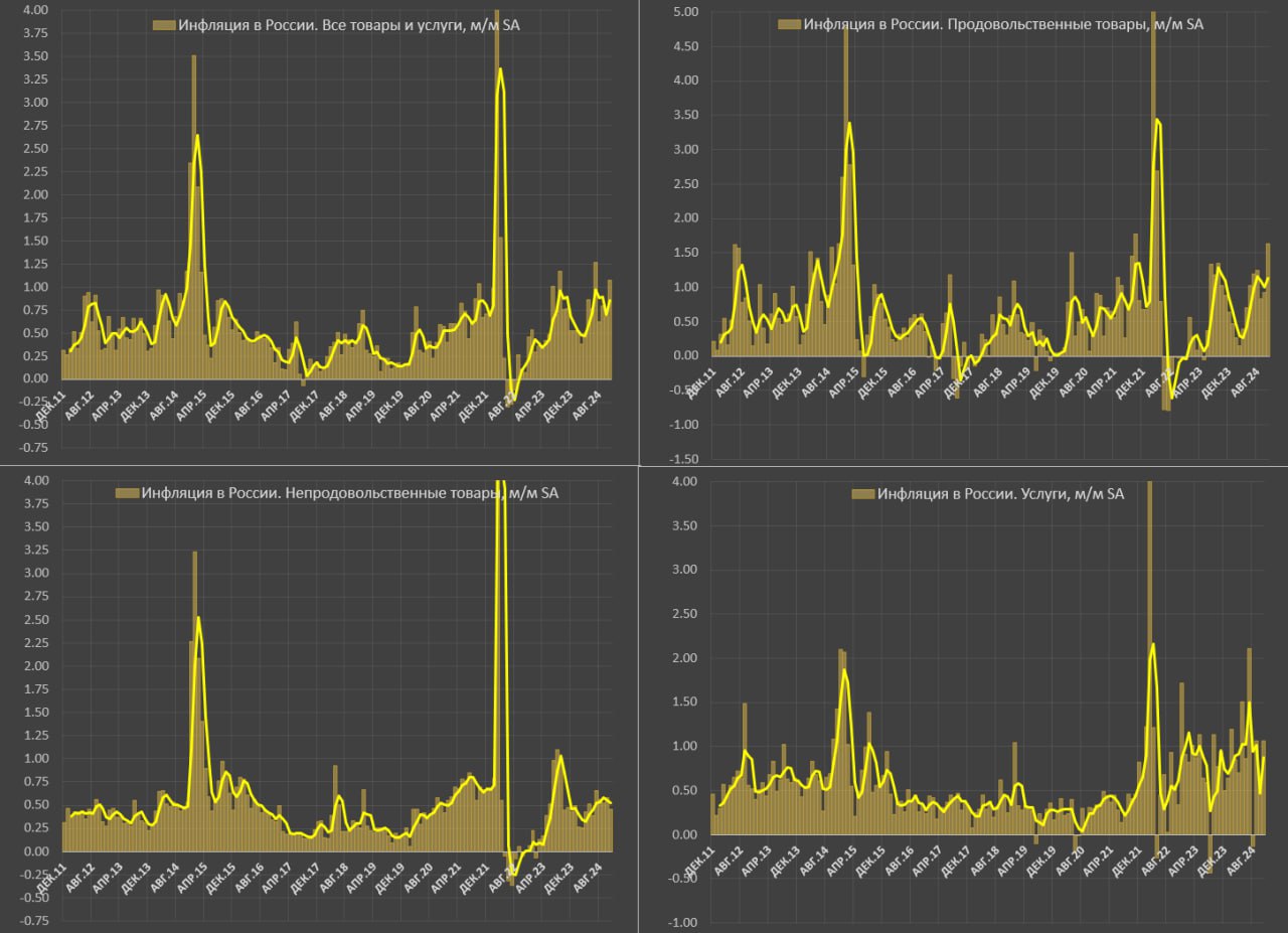 Не считая ценового выброса весной 2022, более существенный рост цен после начала СВО был в сен.23 – 1.17% и в июл.24 – 1.27% м/м.