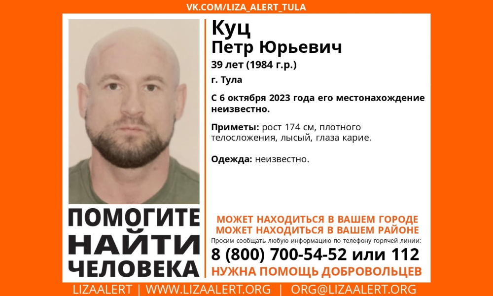 В Туле пропал 39-летний мужчина Куц Петр Юрьевич, сообщает региональный поисково-спасательный отряд «Лиза Алерт». Его местонахождение неизвестно с понедельника, 6 ноября.