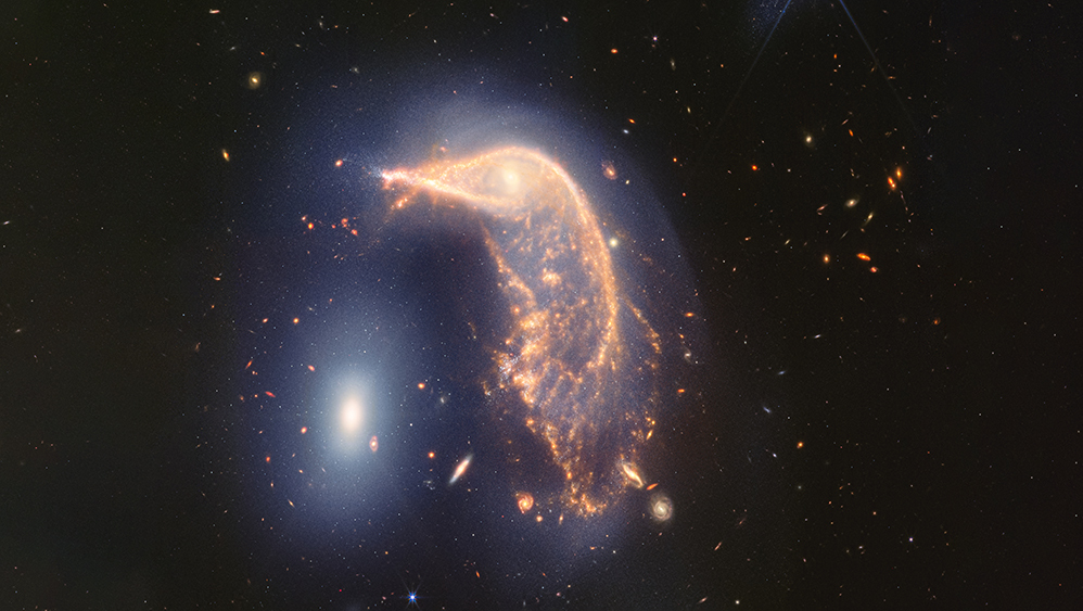 Дуэт взаимодействующих галактик отмечает вторую годовщину работы космического телескопа им. Джеймса Уэбба. Изображением поделились в Институте космических телескопов (США). Невидимый человеческим глазом инфракрасный свет, на котором специализируется «Уэбб», показывает, что эти галактики, известные под общим названием Arp 142, заперты в медленном космическом танце. Их объединяет дымка, представленная синим цветом — смесь звезд и газа.