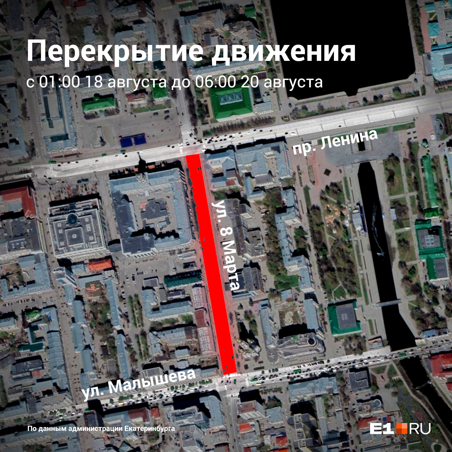 В час ночи 18 августа будет ограничено движение по улице 8 Марта, от улицы Малышева до проспекта Ленина. Восстановится оно только в 6 утра 20 августа.