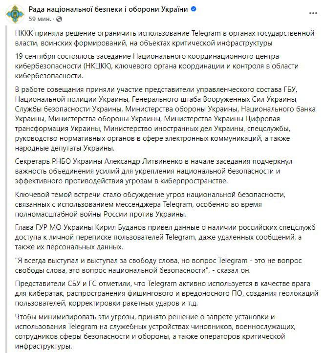 Решение о запрете принял Национальный координационный центр кибербезопасности. На совещании присутствовали сотрудники Нацполиции, Генштаба ВСУ, СБУ, Минобороны Украины, Нацбанка и других ведомств. По словам главы ГУР Кирилла Буданова, у российских спецслужб есть доступ к личной переписке пользователей Telegram, даже к удалённым сообщениям и персональным данным. По словам Буданова, вопрос запрета пользоваться мессенджером — это вопрос национальной безопасности Украины.