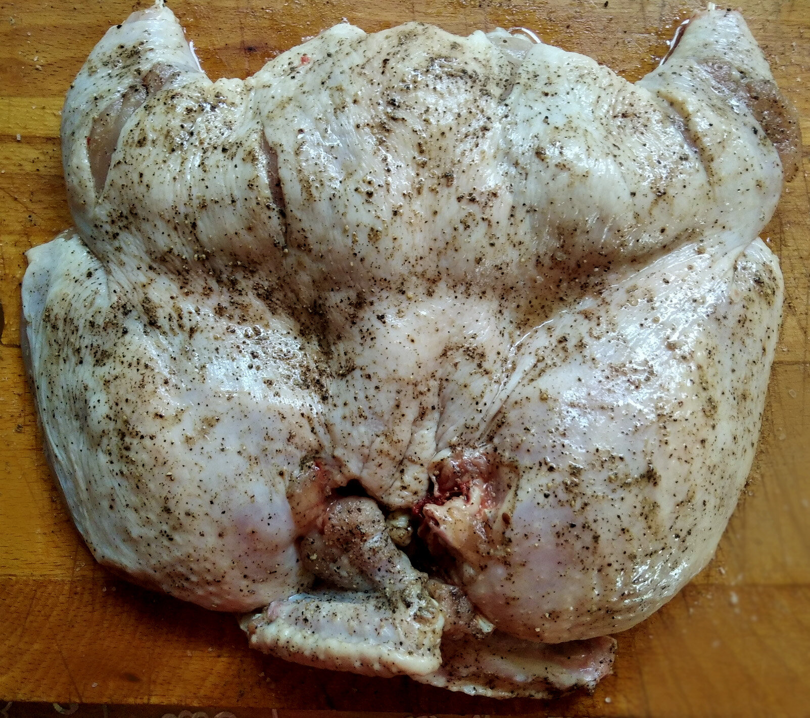 2. Разрезаем по стороне грудки и кладём курицу плашмя. Посыпаем солью и перцем сначала с одной стороны, потом с другой.