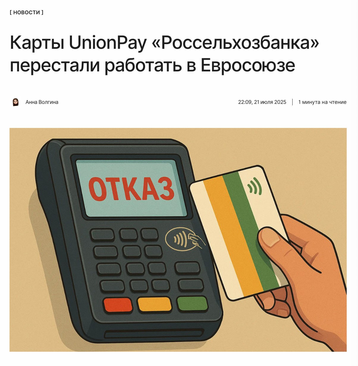 Карты UnionPay от Россельхозбанка перестали работать в странах ЕС. Предположительно, всему виной новый пакет санкций.