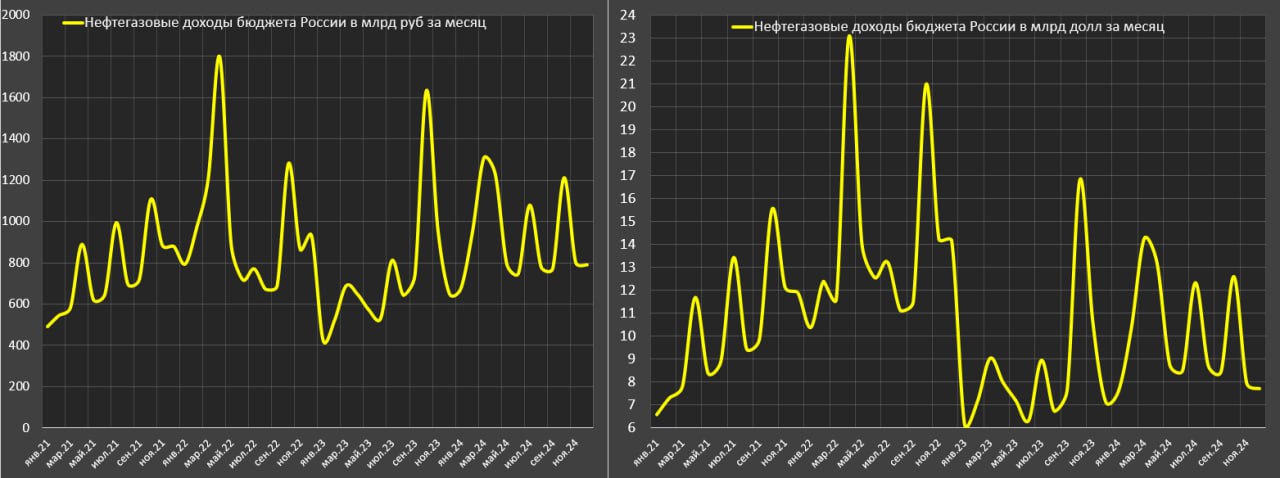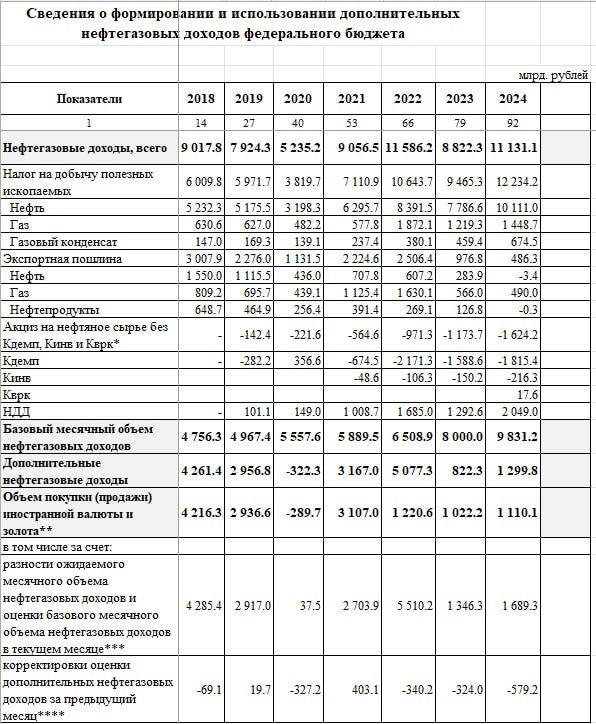 По результатам за 2024 нефтегазовые доходы составили 11.1 трлн vs 8.82 трлн в 2023, 11.6 трлн в 2022 и 9.1 трлн в 2021.