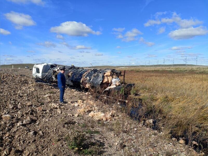 По предварительным данным, водитель, перевозивший цистерну с битумом, потерял управление, и машина съехала в кювет. Водитель скончался от полученных травм на месте.