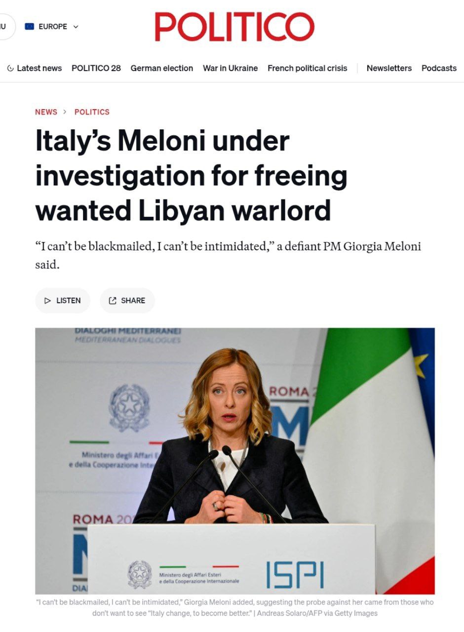 Премьер министр Италии Джорджия Мелони отказалась исполнять решение суда в Гааге и сама попала под следствие. Итальянские прокуроры расследуют ее деятельность по факту отказа арестовывать ливийского генерала, разыскиваемого Международным уголовным судом (МУС). Усама Эльмасри Нджим, глава ливийской судебной полиции, обвиняется базирующимся в Гааге Международным уголовным судом в военных преступлениях и преступлениях против человечности, включая пытки, изнасилования и убийства. Он был арестован в начале этого месяца в Турине, куда ездил смотреть футбольный матч «Ювентуса». Но итальянский суд освободил его 21 января, постановив, что прокуроры допустили процессуальную ошибку. Впоследствии он вернулся в Ливию на итальянском правительственном самолете, по словам ливийского правительственного чиновника, несмотря на ордер МУС на его арест. https://t.me/banksta/61185
