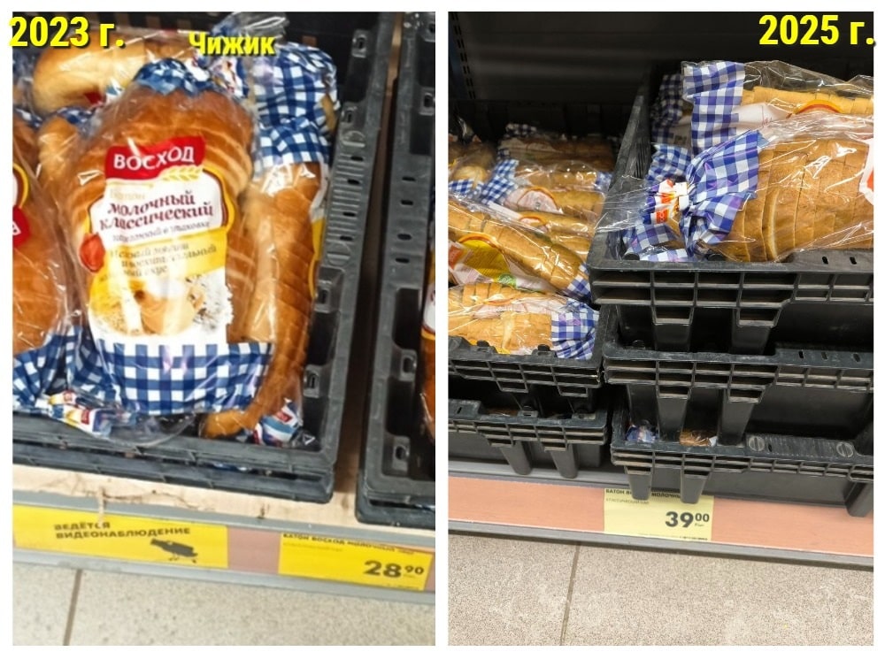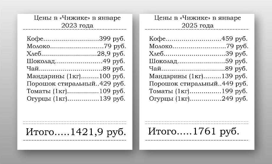 По крайней мере, если собрать такую корзину, что собрали мы. Итак, в «Чижике» цена за корзину из одних и тех же 9 товаров за два года выросла примерно на 300 рублей. То, что раньше можно было купить на 1421,9 рубля, сейчас стоит 1761 рубль. И это еще не самый дорогой магазин.