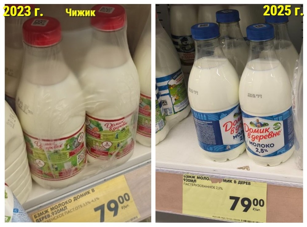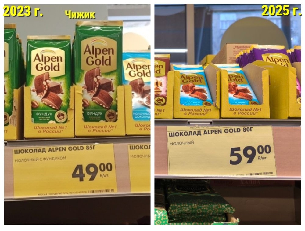 Снова отметим, что эта подборка все равно примерная и товары не полностью совпадают. Так, если присмотреться к фотографиям, можно увидеть, что молоко в «Чижике» стали продавать чуть меньшей жирности, а шоколад за два года потерял в весе 5г – с 85 до 80 г. Причем с весом у этой марки творится что-то странное. В «Магните» у Alpen Gold граммовка 80/85 г, а два года назад была 90/85 г.