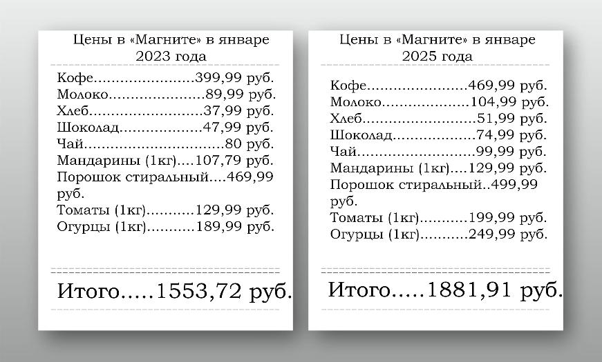 В «Магните» эта корзина дороже еще на 100 рублей в 2025 году – 1881,91 рубля. Два года назад эти же продукты можно было купить в «Магните» за 1553,72 рубля.
