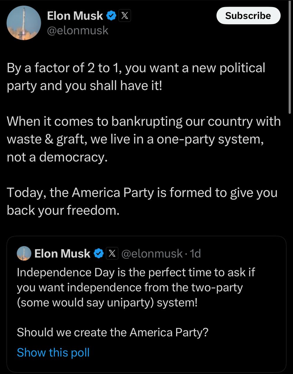 Илон Маск заявил о создании новой политической силы — Американской партии. По его словам, цель инициативы — восстановление свободы и преодоление однопартийного господства, под которым он подразумевает политическую систему, погрязшую в расточительстве и коррупции.