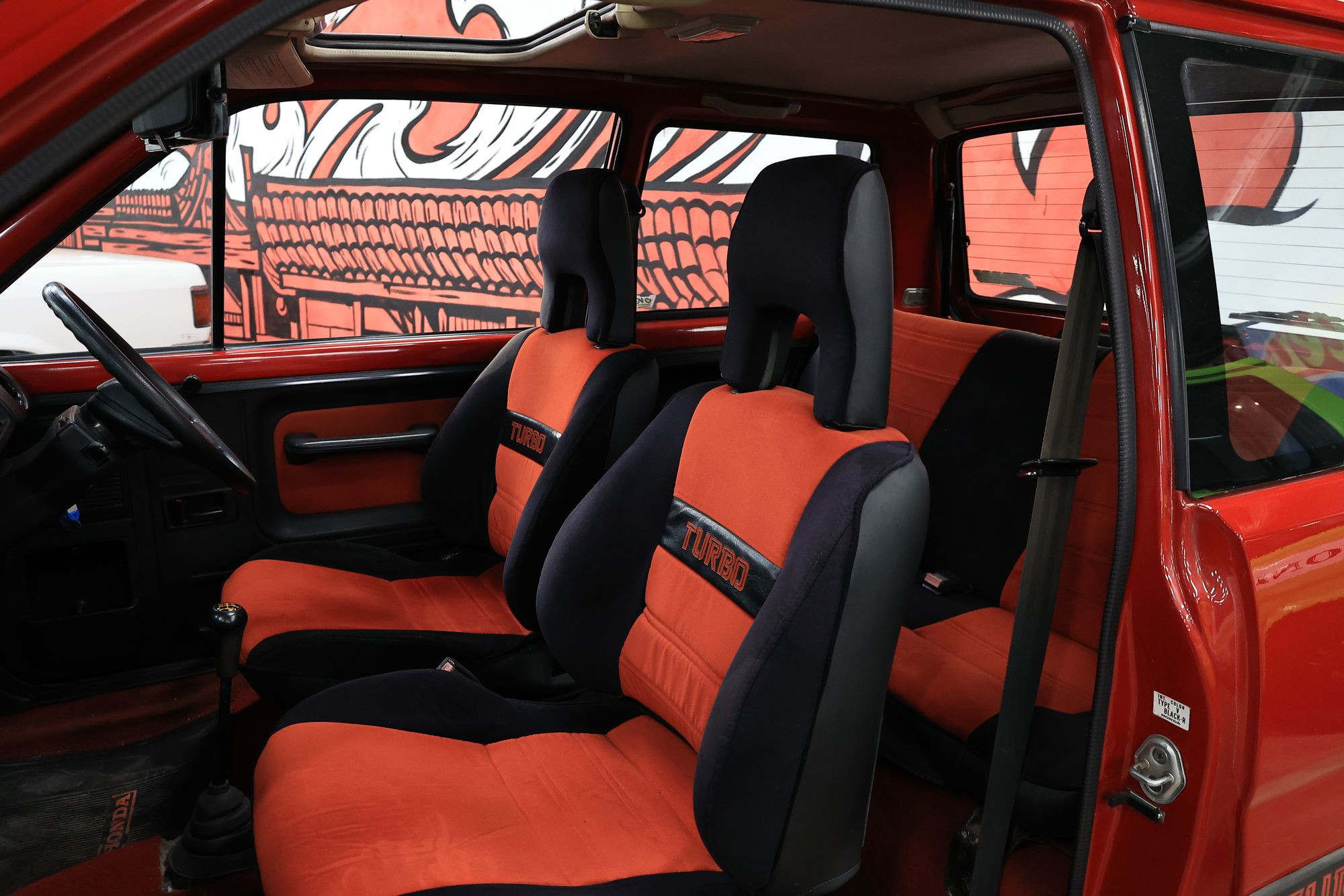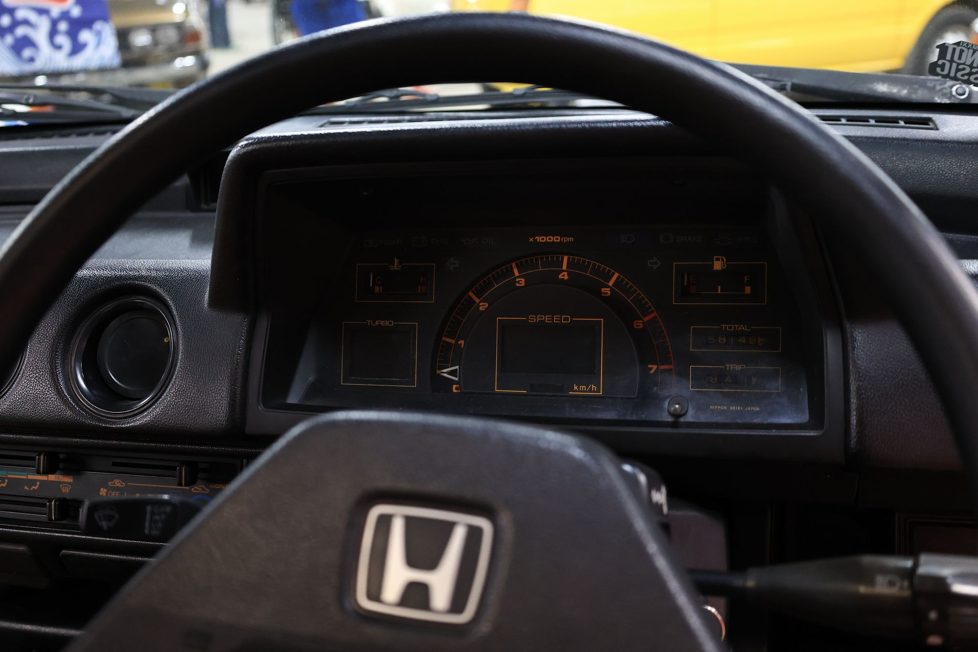 Внутри Honda City Turbo, как и внутри большинства машин 80-х, как-то по-домашнему уютно. Да, многое в Turbo отличается от обычного City – упор сделан на спортивность, но даже эта спортивность какая-то мягкая, «бабушкина». Линии торпедо и дверных карт просты и спокойны, они не совершают причудливых изгибов и пируэтов, как на современных автомобилях. Модные в те годы «цифровые» элементы приборной панели, характерные именно для версии Turbo, запросто сочетаются с аналоговыми стрелочными часиками.