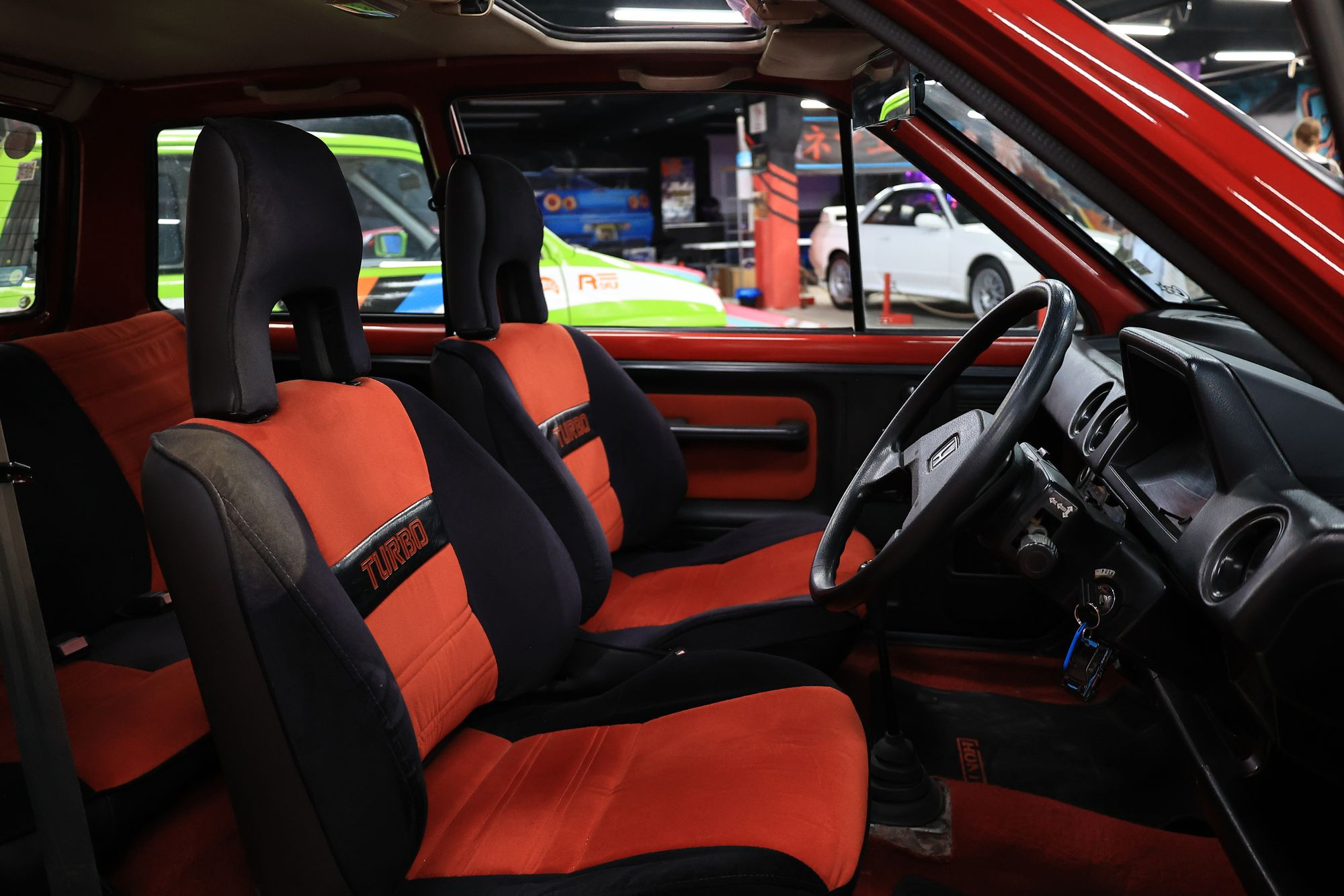 Управление нельзя назвать острым – от упора до упора руля три оборота. Но это вынужденная мера, с целью обеспечения легкости руля без гидро- и электроусилителей. Тем не менее рулится машина великолепно – благодаря шикарному хвату спортивных кресел, продуманной штатной геометрии подвески, двум стабилизаторам и свежим стойкам и пружинам Tein по кругу, с помощью которых владелец реализовал еще и небольшое занижение.