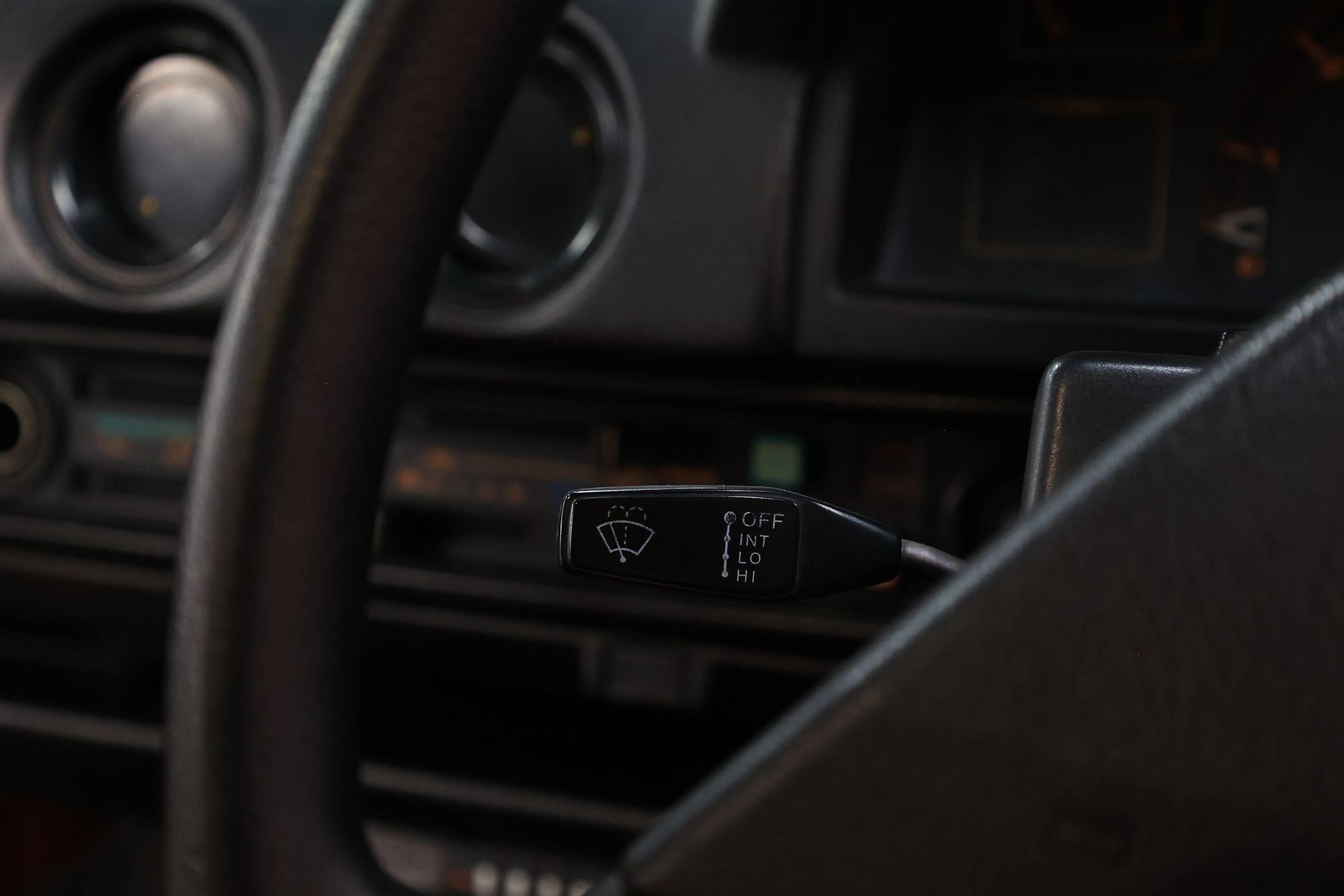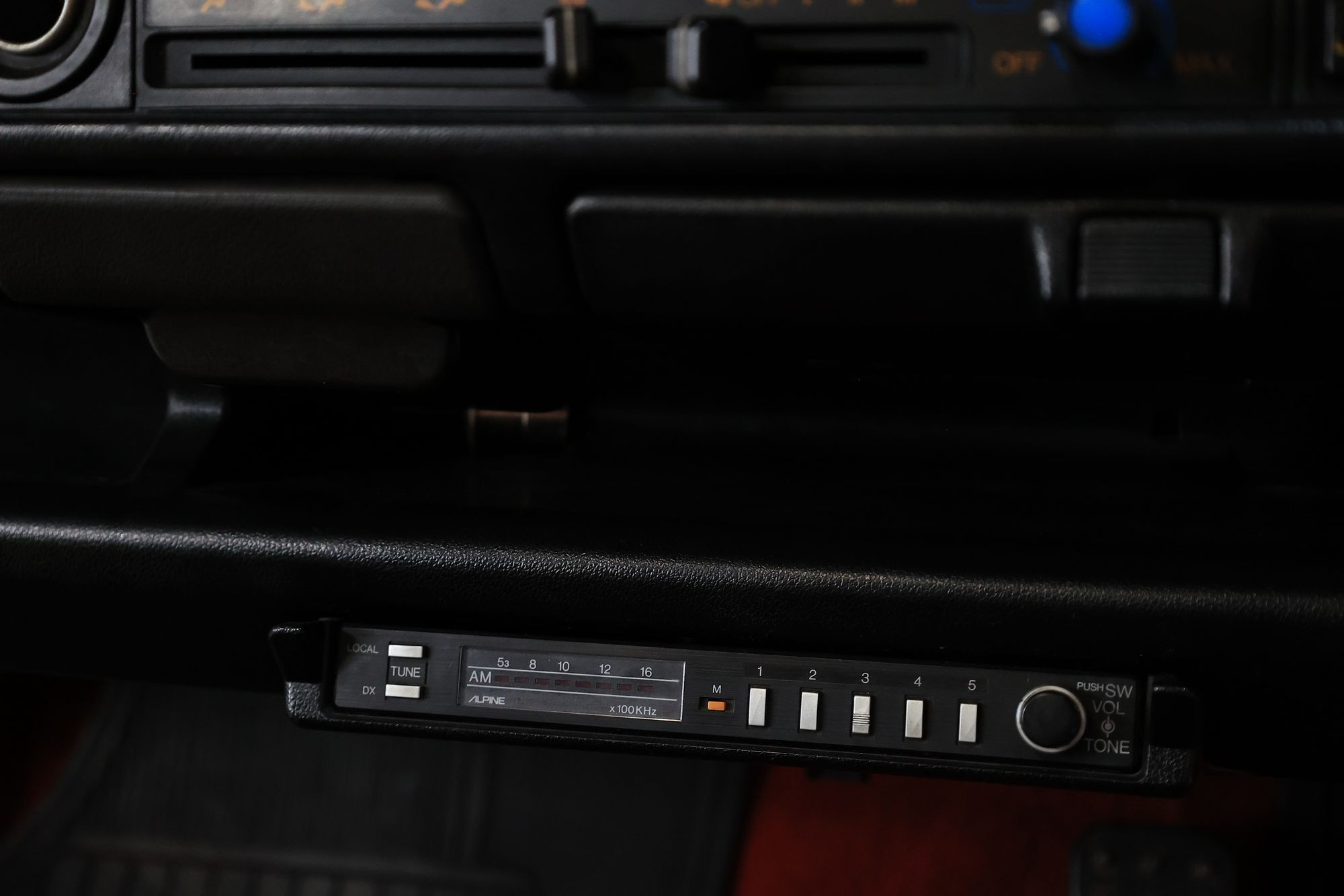 В машине чудом сохранился штатный радиоприемник! Он не вписывается в формат DIN – более длинный и широкий, но при этом малая высота позволила разместить его под торпедо, в пластиковом кожухе, аналогичном «бороде» для магнитолы на наших 41-х Москвичах. Радиоприемник производства Alpine со средневолновым диапазоном 530-1600 кГц, принимающим AM-модуляцию, с памятью (!) на пять станций.