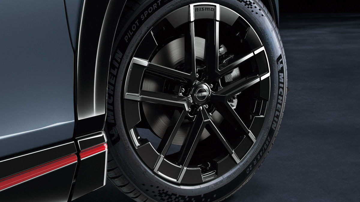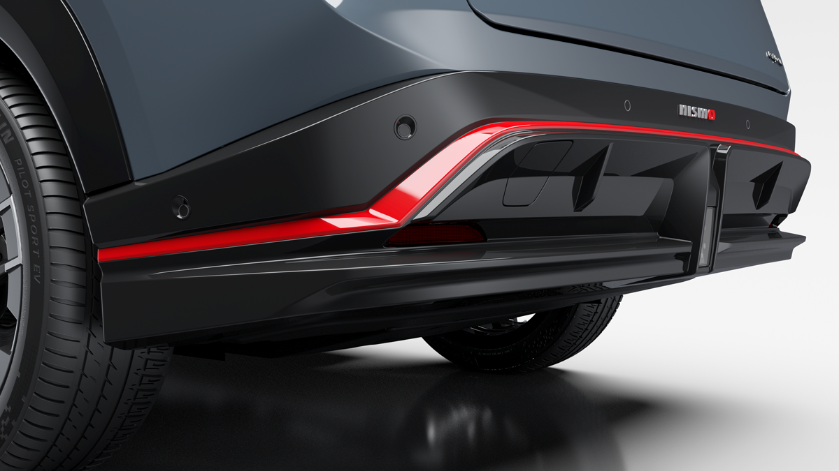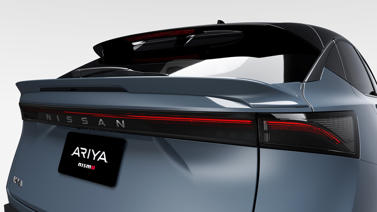 Корма тоже получила свою долю изменений, при этом у Nissan Ariya Nismo те же фонари, выполненные в виде единой широкой полосы проходящей через всю ширину багажной двери. В нижней части бампера можно увидеть шильдик Nismo с красной «о» и дополнительный спойлер, размещённый непосредственно над линией задней оптики. О европейском варианте информации пока нет, однако известно, что для японского варианта предусмотрен новый комплект оригинальных 20-дюймовых колёсных дисков.