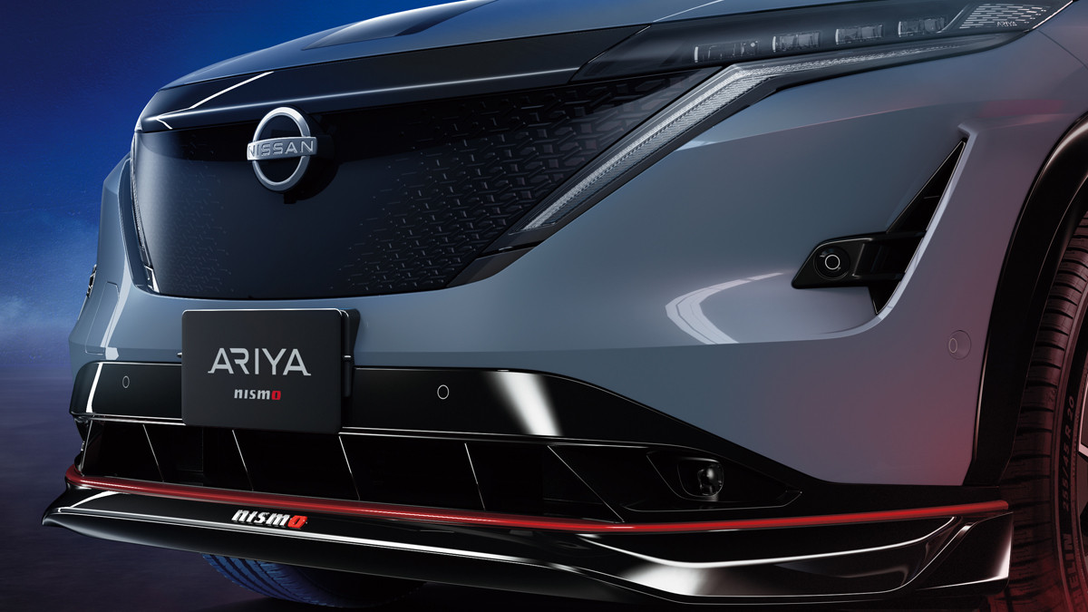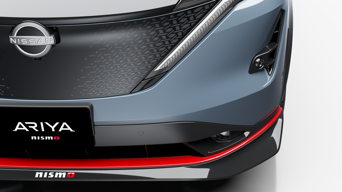 У «подогретого» кроссовера такая же головная оптика с фирменной заглушкой на месте традиционной решётки радиатора, как у обычной Ariya, однако иначе оформлен передний бампер. Вариант Nismo получил изменённые боковые и центральный воздухозаборники, а в кромку нижней части интегрирован сплиттер из глянцевого пластика чёрного цвета. Ещё такой SUV имеет контрастную красную тонкую полоску, которая охватывает кузов по периметру. Кроме того, красными штрихами снабдили корпуса наружных зеркал.