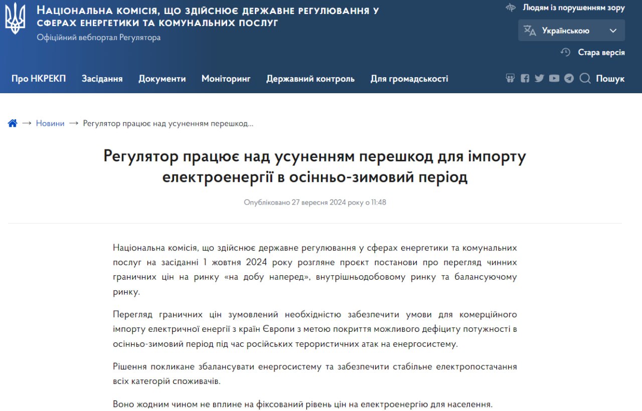 Проект постановления о пересмотре цен уже 1 октября рассмотрит Нацкомиссия. Это необходимо для того, чтобы обеспечить условия для коммерческого импорта электроэнергии из стран ЕС, который покроет возможный дефицит осенью и зимой во время российских обстрелов.