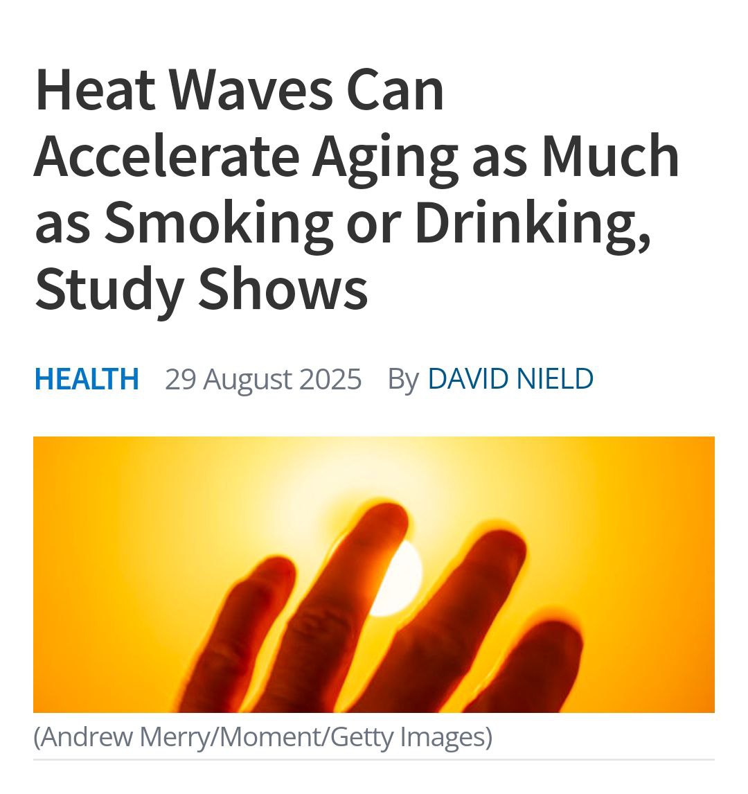 Оказалось, что жаркая погода старит организм на уровне супер вредных привычек — биологическое старение развивалось гораздо сильнее при высоких температурах.