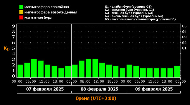 В пятницу, 7 февраля, К-индекс поднимется до 3 баллов, что не считается магнитной бурей. Пик солнечной активности ожидается в середине дня. В остальные часы сила геоударов будет находиться на уровне 1–2 баллов, что называют спокойной магнитосферой.
