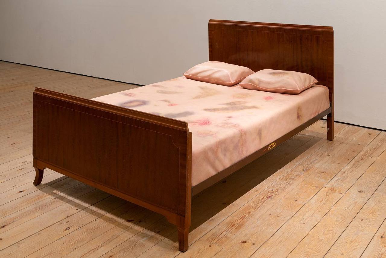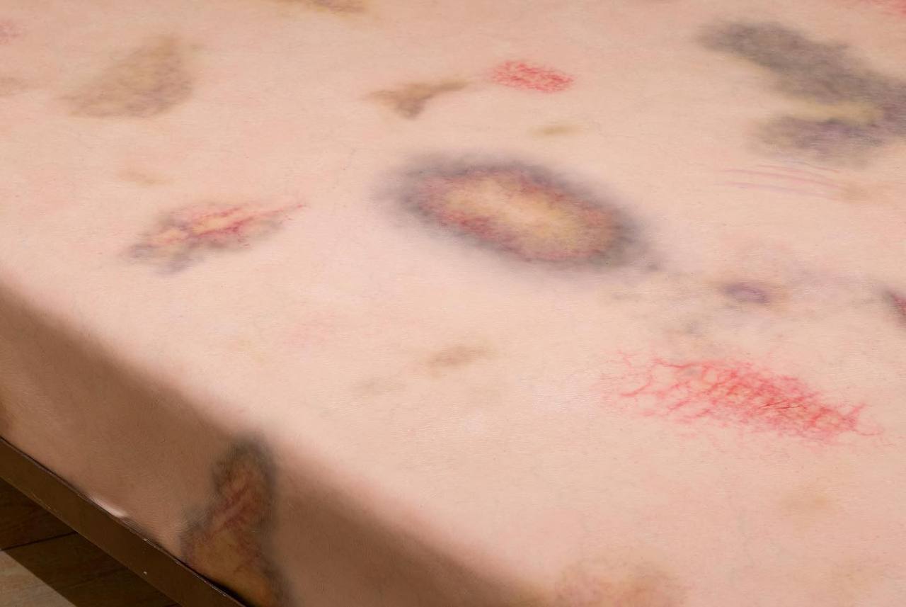 Эта работа заменяет хрустящее, чистое постельное белье на кровати синяками и ссадинами на коже — следами жестокого обращения и травм. Синяки и пятна — результат сценария, который разворачивается в безопасности дома, скрытый уединением спальни».