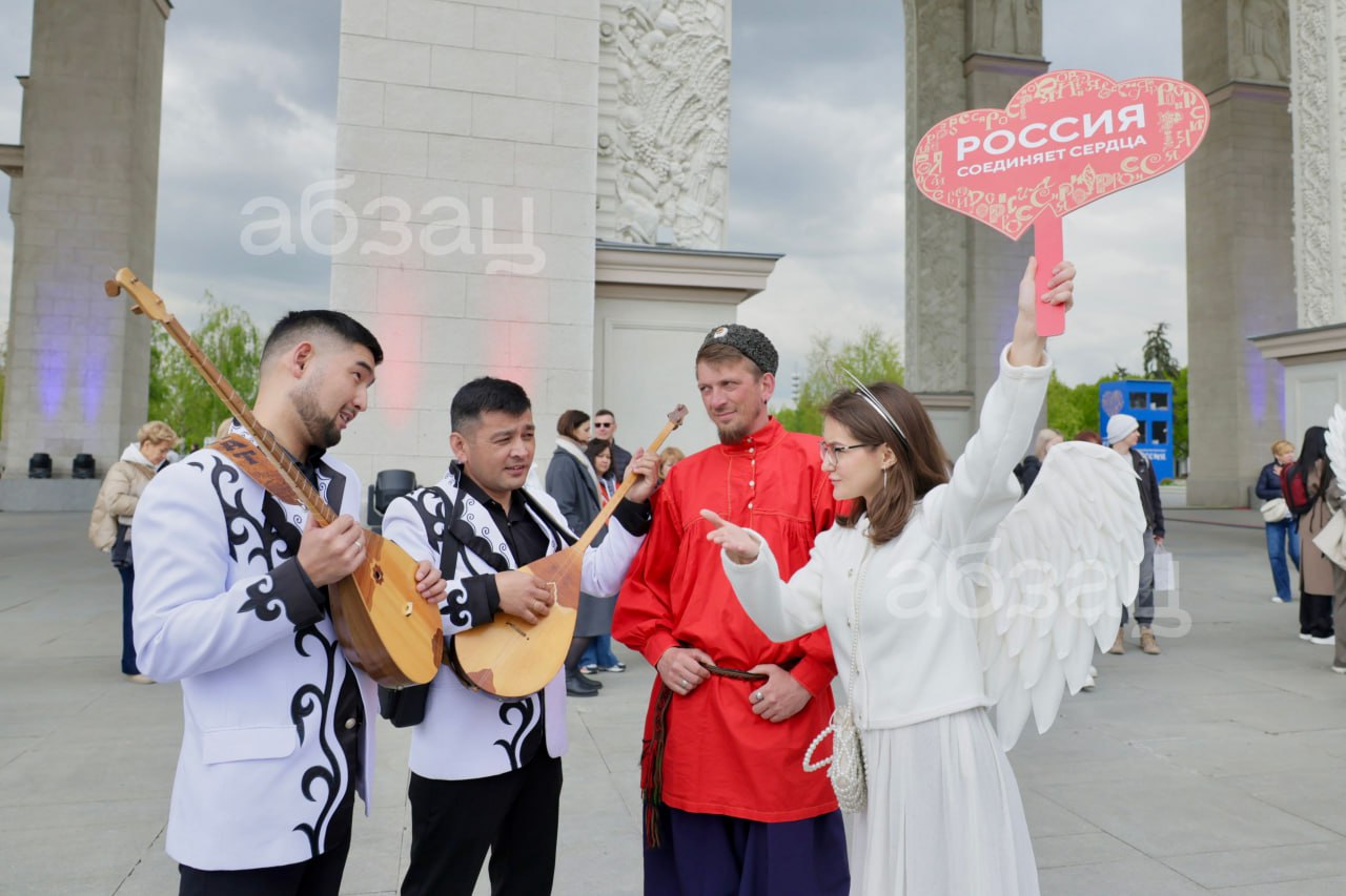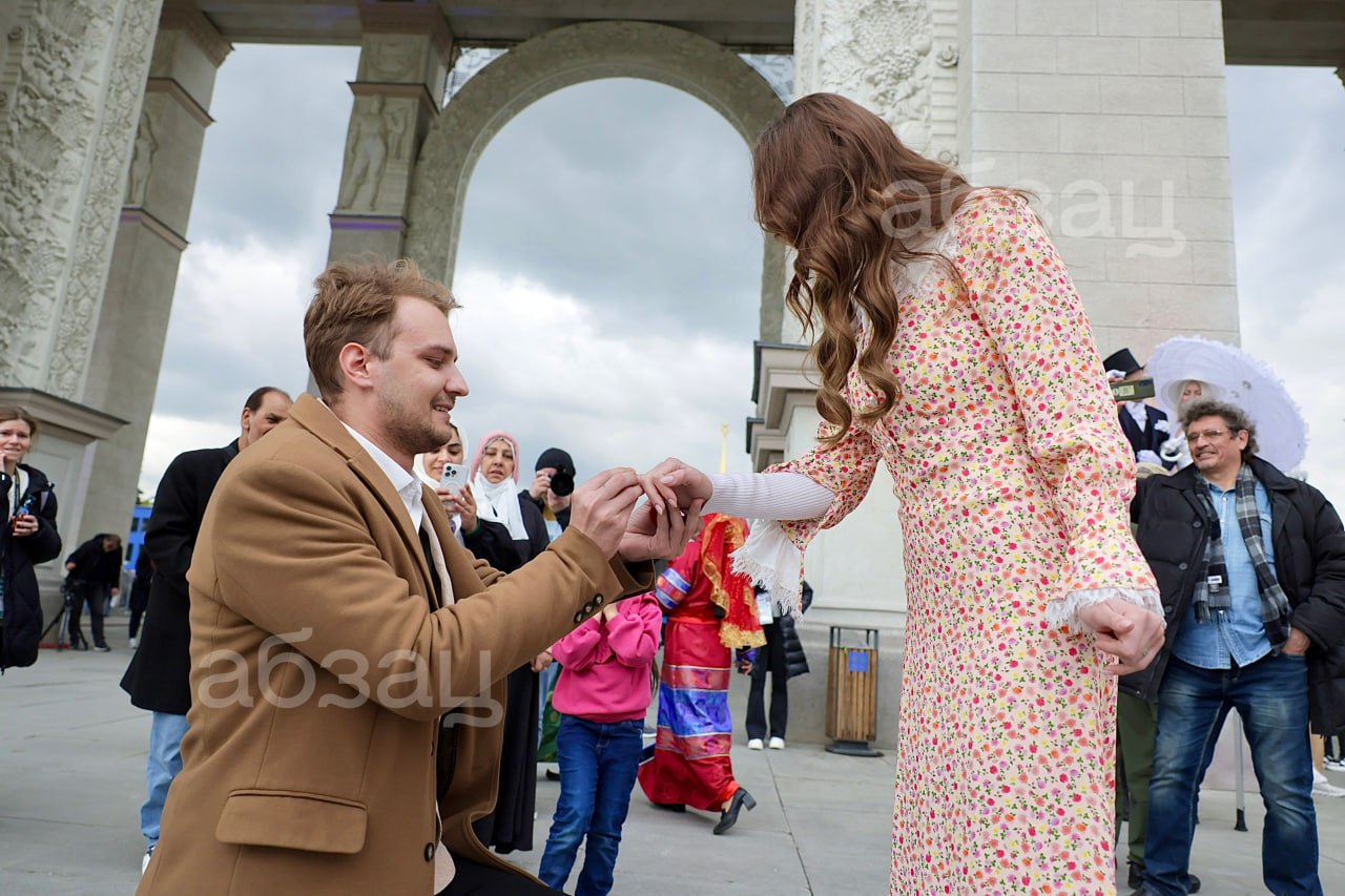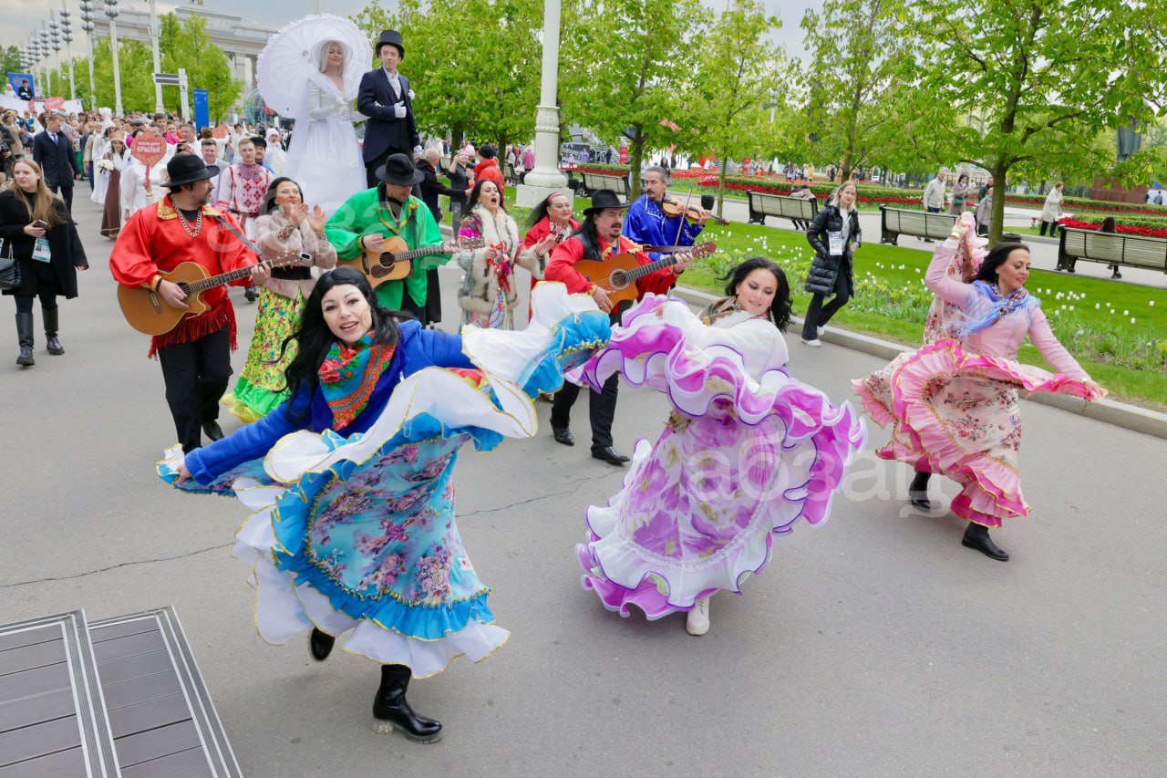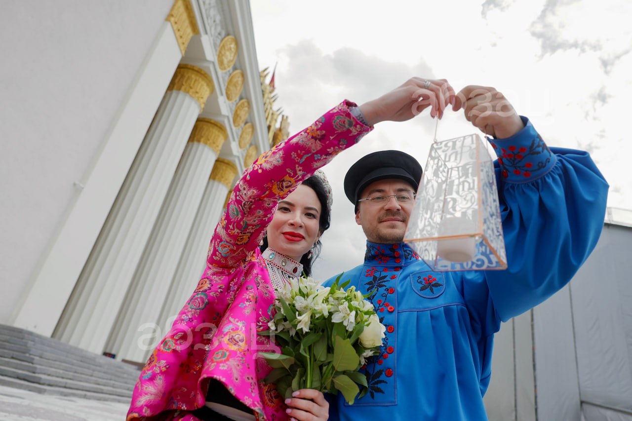 Церемония, поцелуи, танцы, угощения и даже цыгане – всё это сегодня было на ВДНХ на театрализованном свадебном шествии пар, которое прошло в рамках выставки «Россия».