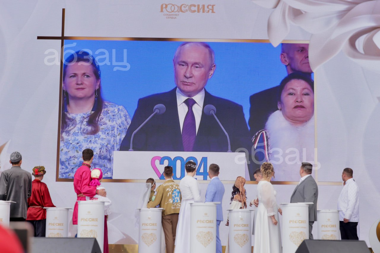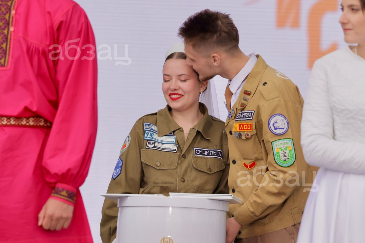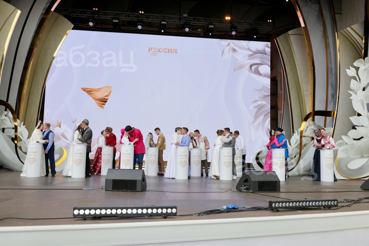Свои свадебные традиции показали пары из Сибирского федерального округа. На главной уличной сцене провели торжественную церемонию бракосочетания.