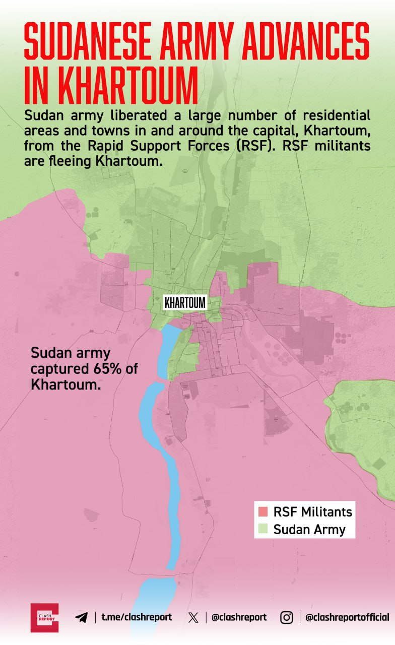 ❗️Армия Судана освободила значительную часть столицы страны Хартума, отбив 65% столицы у боевиков Сил быстрого реагирования, которые, как сообщается, покидают город