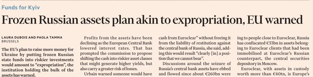 «План по захвату российских замороженных активов сродни экспроприации». Во под каким заголовком сегодняшняя Financial Times приводит мнение Валери Урбен, руководительницы Euroclear (депозитария, который и контролирует основные российские активы за рубежом).