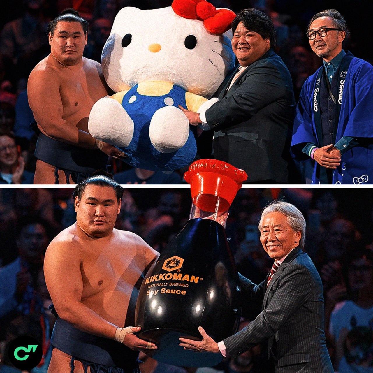 🎁🎁 Победителю престижного турнира по сумо The Grand Sumo Tournament подарили гигантскую плюшевую игрушку Hello Kitty и такую же по размерам бутылку соевого соуса