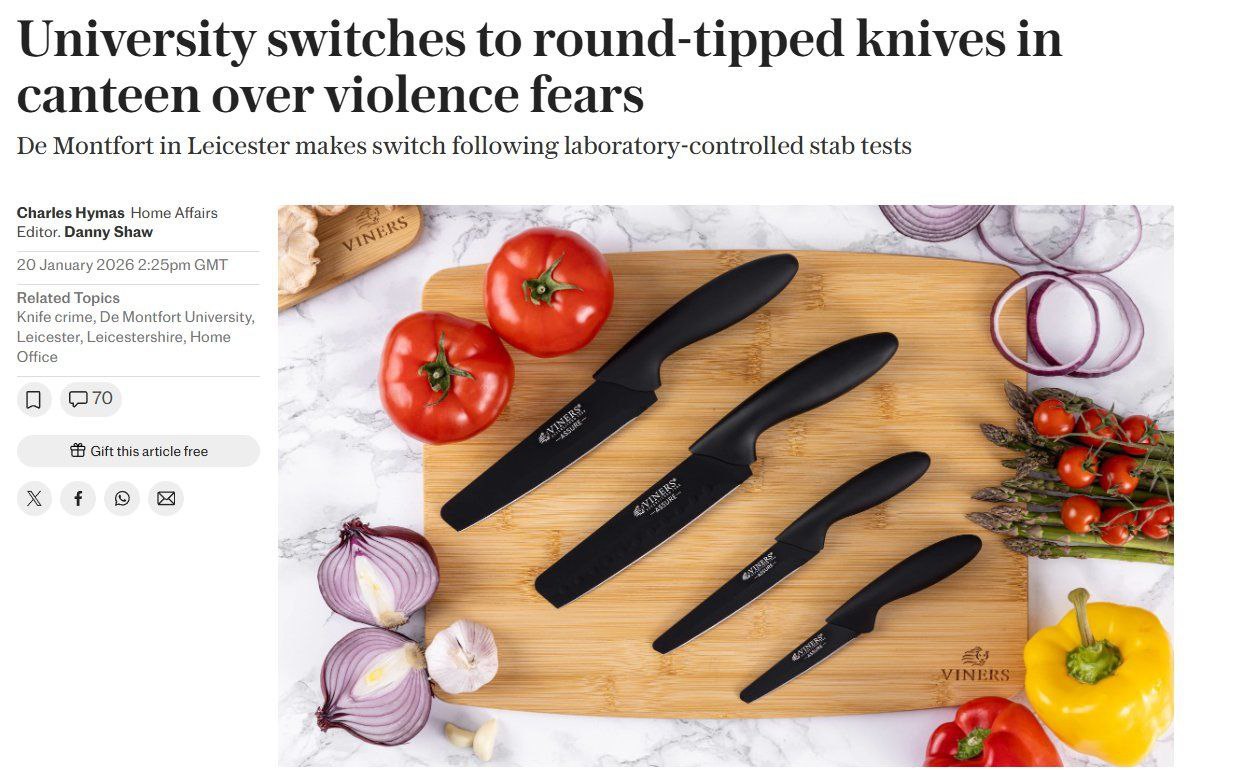 В английских университетах начали запрещать обычные ножи из-за страха ножевых атак. Инициативу запустила Лейса Николс-Дрю, доцент кафедры судебной биологии. Она сотрудничает с г-жой Лукас, преподавателем йоги, которая получила серьезные ранения во время нападения мигранта в Саутпорте в июле 2024 года.