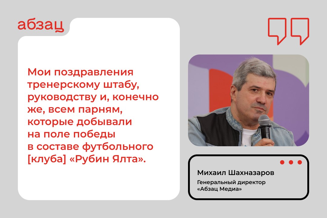 Генеральный директор «Абзац Медиа» Михаил Шахназаров поздравил ФК «Рубин Ялта» с завоеванием серебряных медалей Второго дивизиона чемпионата России по футболу: