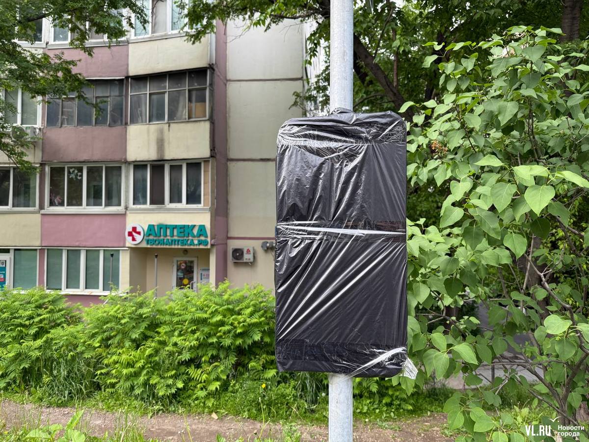 На Океанском проспекте тоже нанесли разметку и установили знак. Но символ платной парковки в виде монеток внизу знака заклеили синим скотчем. Табличку с информацией, ценой и номером уже повесили, но спрятали под чёрный мусорный пакет.