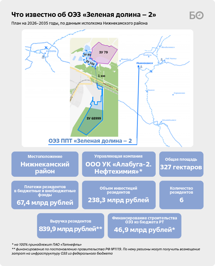 Инициативу по созданию новой ОЭЗ 17 июля уже одобрили депутаты Госсовета РТ. Любопытную информацию удалось почерпнуть из презентации главы района Радмира Беляева. Общая площадь «второй» «Зеленой долины» составит 327 га (почти в 20 раз больше первой очереди), 6 резидентов вложат в проекты 238,3 млрд рублей (59,8 млрд рублей — собственные средства) и создадут 1,8 тыс. рабочих мест. С 2026 по 2035 годы они заплатят в бюджеты разных уровней 67,4 млрд рублей. При этом бюджет республики раскошелится на 46,9 млрд рублей, чтобы построить инфраструктуру для ОЭЗ. Финансирование будет вестись по постановлению правительства РФ № 1119. По нему регионы могут получить возмещение затрат на инфраструктуру ОЭЗ из федерального бюджета. Управляющей компанией выступит ООО УК «Алабуга-2. Нефтехимия» (на 100% принадлежит «Татнефти»).