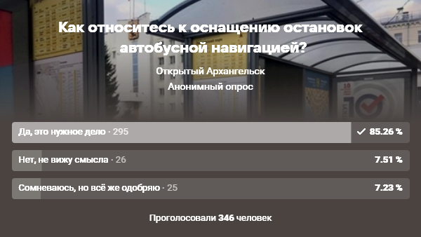 С целью получения обратной связи рекламистами совместо с горадмином был запущен опрос населения относительно востребованности инициативы. Результаты показали, что подавляющему числу архангелогородцев (85 процентов) нравится задумка, поэтому интересный с точки зрения нужд города проект «Реклама с пользой» будет продолжен. Для его масштабирования планируется задействовать транспортную компанию «Рико», обслуживающую абсолютное большинство маршрутов в городе.