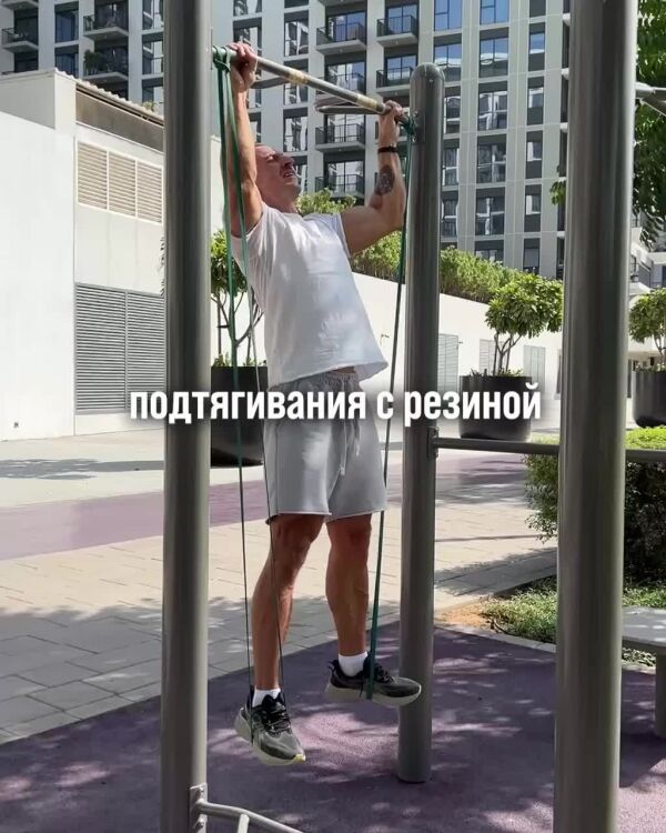 Подтягивания с резиной. Мы почти на финишной прямой! Это упражнение похоже на классическое подтягивание, но выполняется с помощью специальной тренировочной резины. Вам понадобятся две такие резинки. Закрепите один конец каждой резинки по бокам перекладины, а в другой конец вставьте ноги. Благодаря натяжению резинок, подтягивания станут легче. Освоив это упражнение, вы постепенно сможете переходить к подтягиваниям без резинки.
