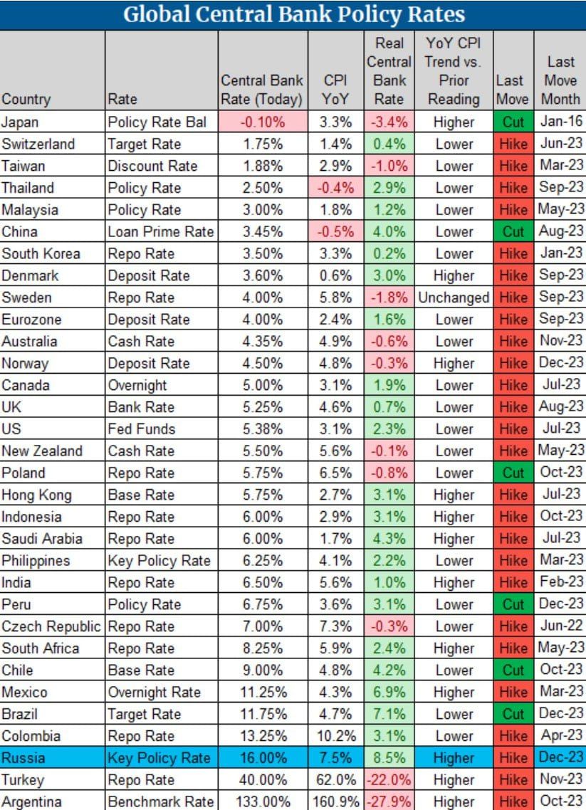Ставки стран мира варьируются от минусовой у Японии до 133% у Аргентины. Россия ближе к последней.