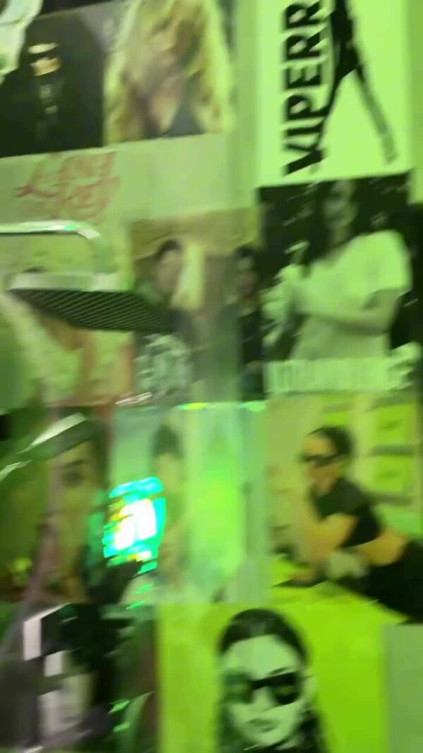 При входе все как у всех, полочка — крючки, полотенца. Однако далее следует сине-желтый неоновый светильник в виде знака биологической опасности. Унитаз полностью обклеен разноцветными стикерами, а возле него лежит коврик кроваво-красного цвета. Но особенно звездную родительницу поразила стена возле ванной, которая полностью завешана постерами.