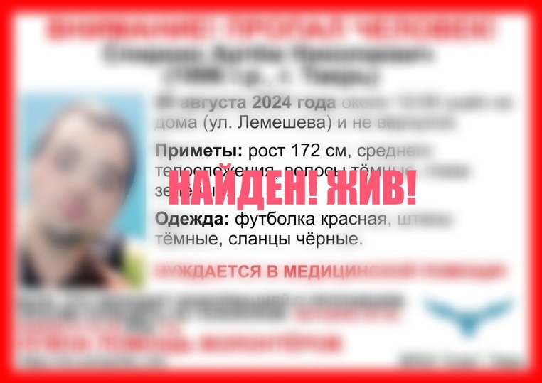 В Твери завершился поиск пропавшего Артема Спиркина, который нуждался в помощи врачей.