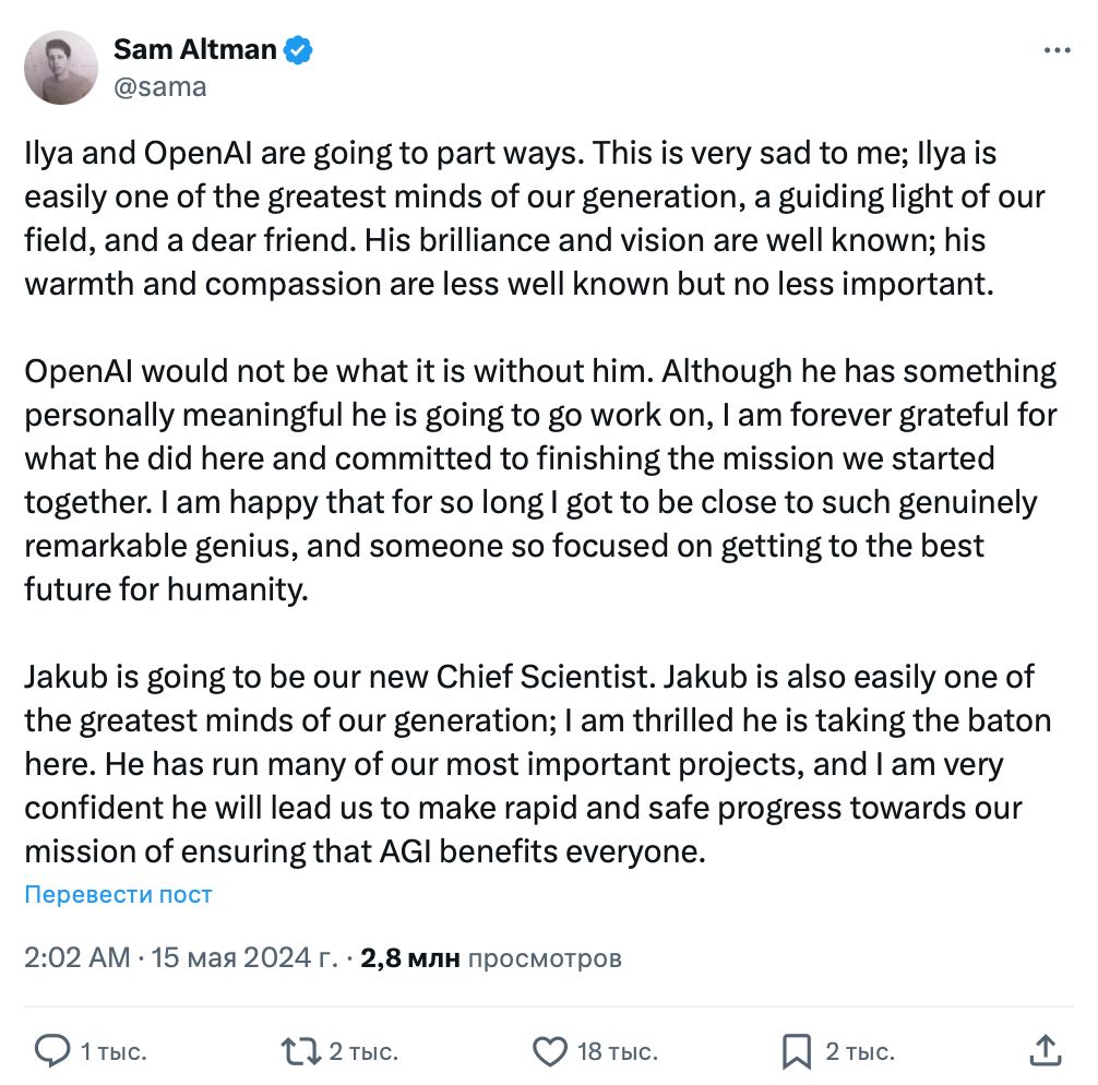 Сооснователь OpenAI Илья Суцкевер уходит из компании. По словам Сэма Альтмана, он собирается заняться личным проектом.