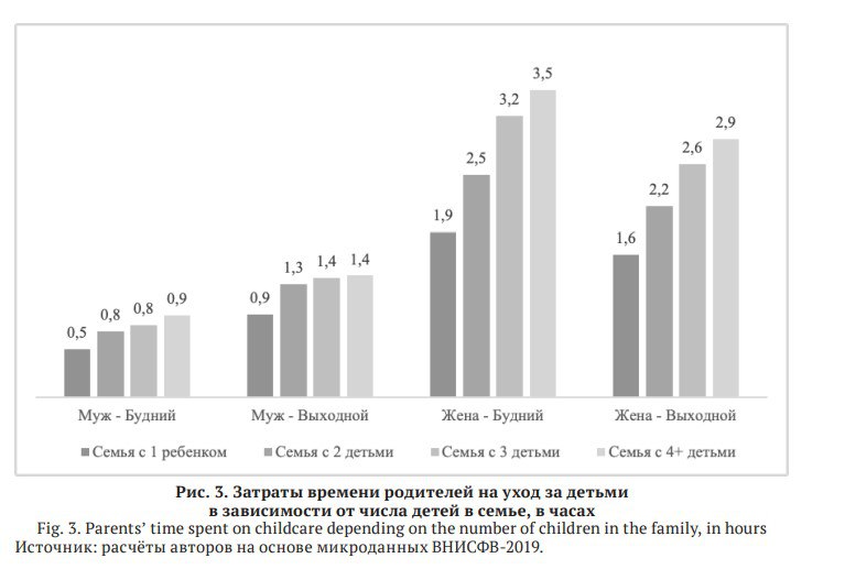 (к предыдущему посту) Непосредственное воспитание и уход за детьми в полных семьях тоже в основном лежит на матерях (у матерей-одиночек эти затраты времени растут ещё больше). Отцы устранены от формирования детей. К примеру, на «уход за детьми (обеспечение питания, мытьё, физический уход) в среднем отец тратит 8,2 минуты в день, мать – 64,4 минуты». Самые трудозатратные занятия отца с ребёнком – «игры и спорт», в среднем 10,8 минуты в день. Можно говорить о том, что у российского воспитания – «женское лицо». Детей в семье воспитывают матери и бабушки (если они есть), в школе – женщины-учителя. Среднестатистического мужчину в России формируют женщины.
