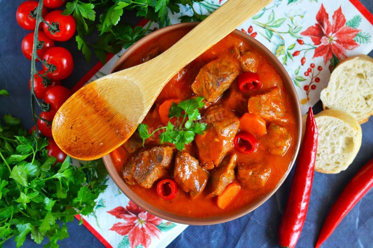4. Добавить томатную пасту, хорошо перемешать. Влить в гуляш 2-3 стакана воды или мясного бульона, перемешать, добавить лавровый лист, накрыть крышкой и тушить на маленьком огне, при слабом кипении час.
