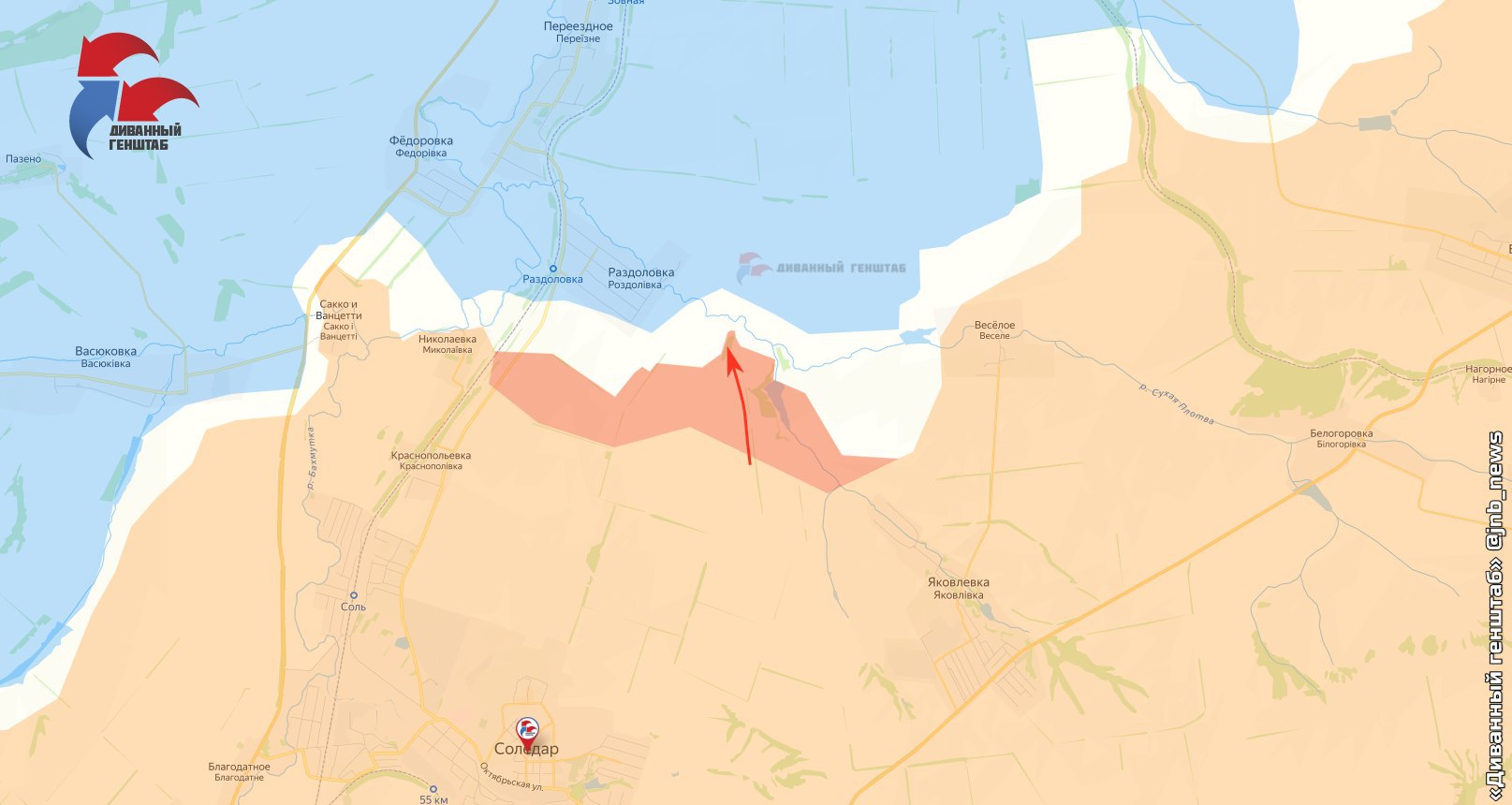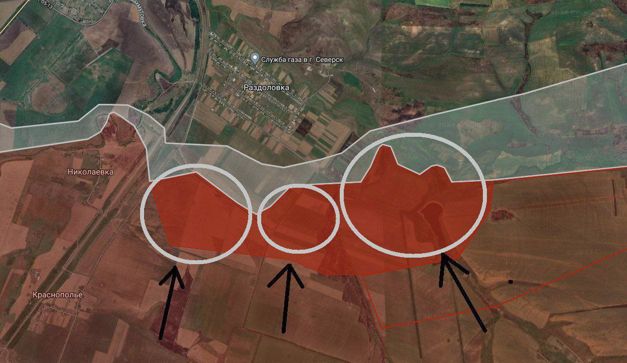Сообщают о продвижении ВС РФ в южном части Северского выступа и в районе Раздоловки. На прошлой неделе наши войска также продвигались в полях и посадках между Раздоловкой и Веселым.