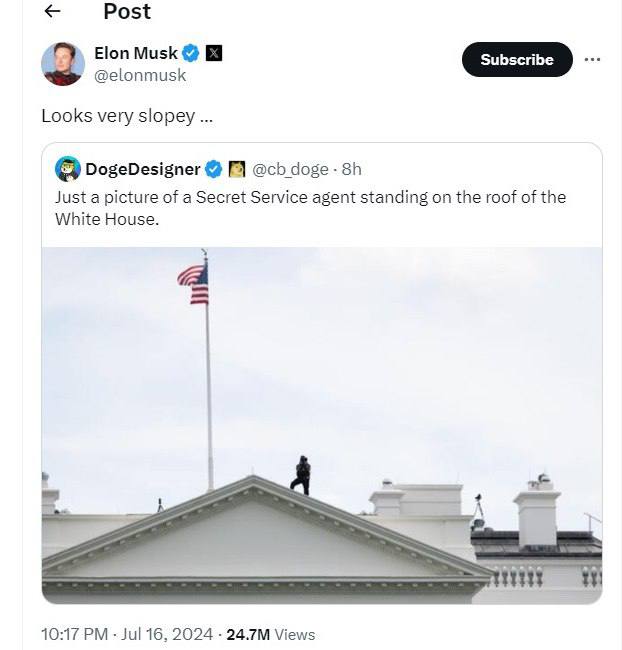 ❗️Илон Маск прокомментировал бредовое объяснение директора Секретной службы США Кимберли Читл отсутствия охраны на крыше, с которой стреляли по Трампу.