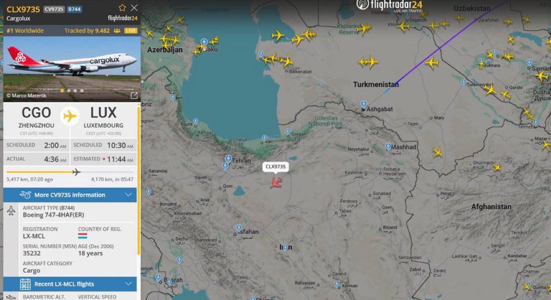Грузовой самолет из Китая летит в Иран. Можно вспомнить, что во время краткосрочной войны Индии и Пакистана, Китай оперативно доставлял в Пакистан военные грузы, в частности ракеты воздух-воздух, показавшие в ходе войны высокую эффективность.