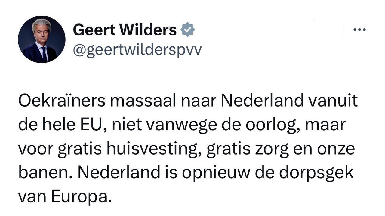 Украинцы стекаются в Нидерланды со всего ЕС не из-за войны, а ради бесплатного жилья, бесплатного здравоохранения и наших рабочих мест. Нидерланды снова стали деревенским дурачком Европы.