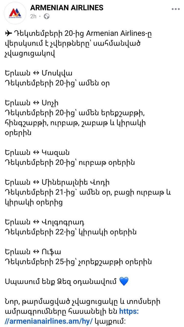 Armenian Airlines объявлили о возобновлении полётов в российские города с 9 декабря, но затем откладывала сроки стартапо причине затянувшегося техобслуживания самолёта (C-check).