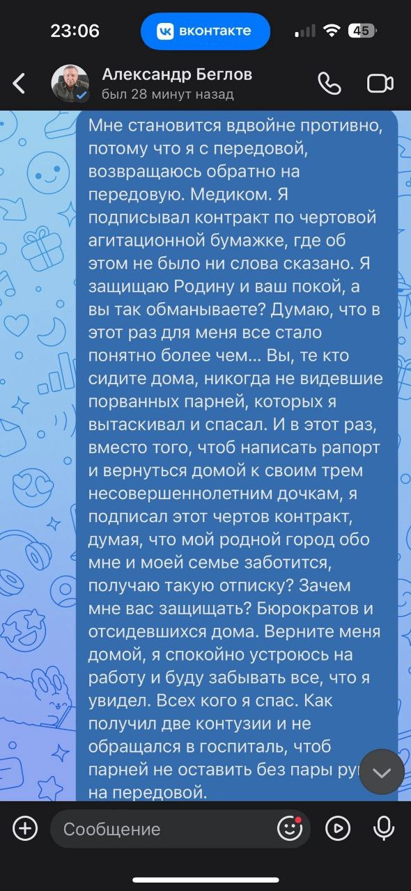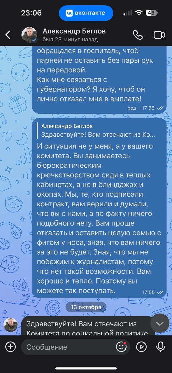Отказ в выплате и Андрей, и Виктор восприняли очень эмоционально и чувствуют себя обманутыми. «Вы же нас разделили на правильных и неправильных. Я, получается, неправильный, потому что контракт заключил с бригадой, а не через пункт отбора. Хотя в агитках ни слова про это не сказано», — поделился Виктор в переписке с комитетом по соцполитике.