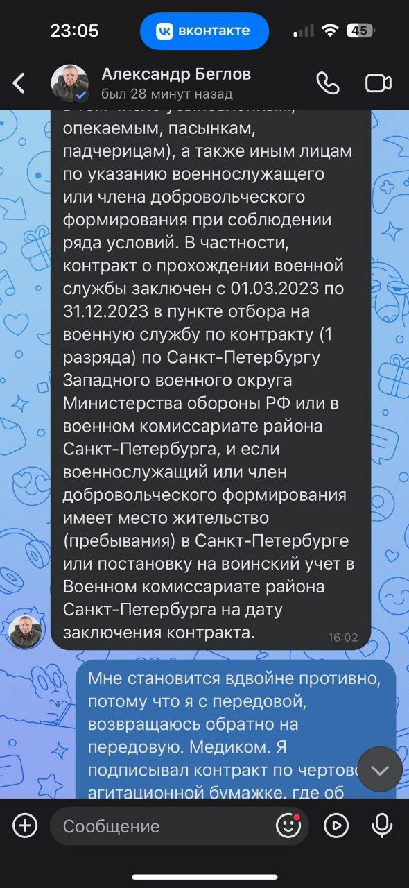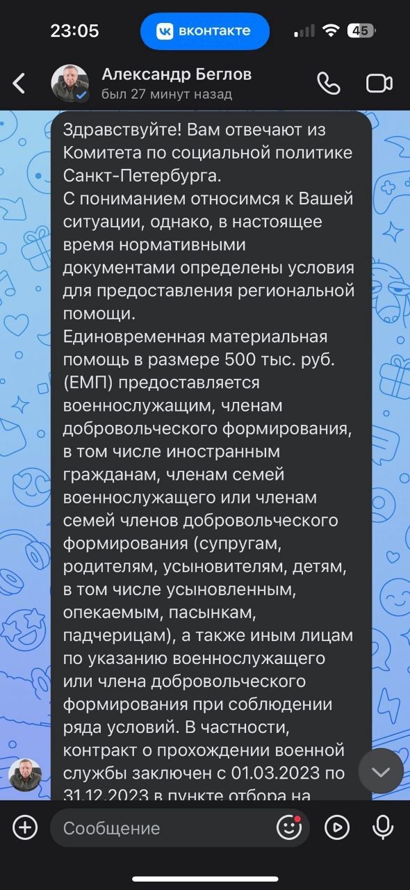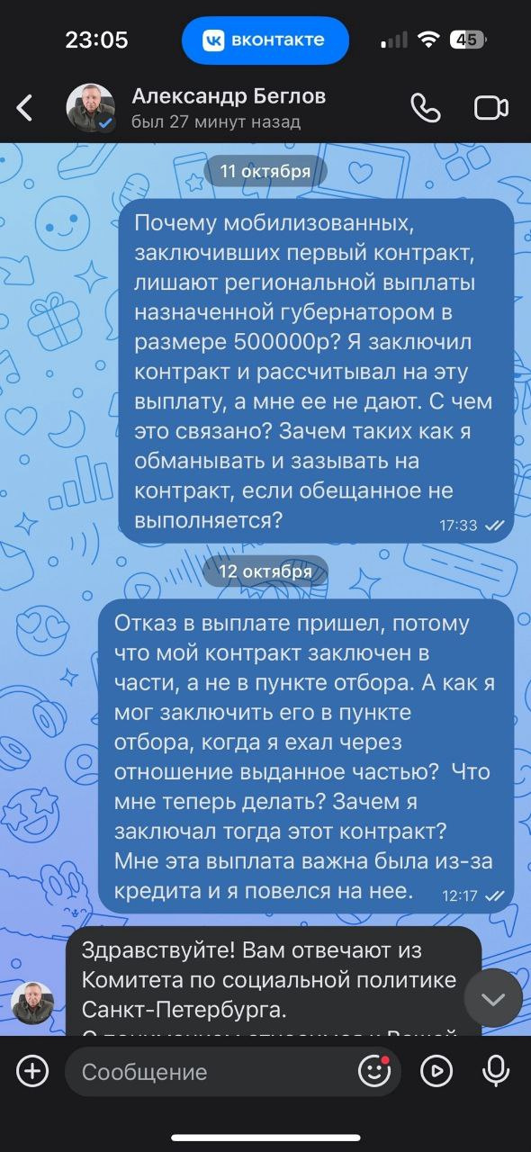 195 тысяч рублей от Минобороны пришли сразу. От «губернатора» не капнуло ничего. В начале октября жена Виктора позвонила в отдел соцполитики Фрунзенского района — ей сообщили, что по заявлению пришел отказ. Написали Александру Беглову через личные сообщения во «ВКонтакте». Ответил комитет по социальной политике: «выплата в 500 тыс. рублей положена при условии, что контракт заключен в пункте отбора на военную службу по контракту по Санкт-Петербургу Западного военного округа Минобороны РФ или в военном комиссариате района Санкт-Петербурга».